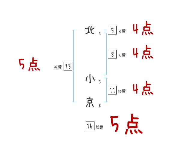 天運![]() | 北小京さんの天運は5画の4つ星!健康で安泰。協調性に優れ、財産に恵まれる。 家系が持つ宿命的な運勢を表します。祖先から受け継いだ苗字ですので自分の力が及びません。家柄を象徴します。 |