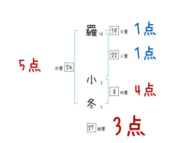 外運![]() | 羅小冬さんの外運は24画の5つ星!家庭運が良く順調な人生。金運にも恵まれる。 生活面を象徴する運勢です。外部から受ける影響力を表し、結婚運、家庭運や職場、環境への順応性を表します。 |
