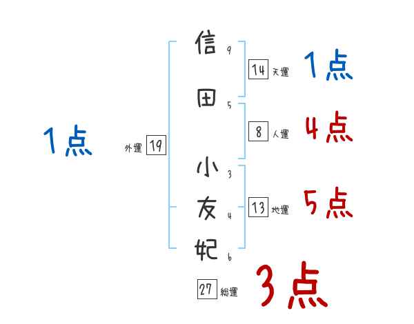 外運![]() | 信田小友妃さんの外運は19画の1つ星!優れた才能を持ちますが、協調性が足りないことも。周りの人と協力する事を意識しましょう。 生活面を象徴する運勢です。外部から受ける影響力を表し、結婚運、家庭運や職場、環境への順応性を表します。 |