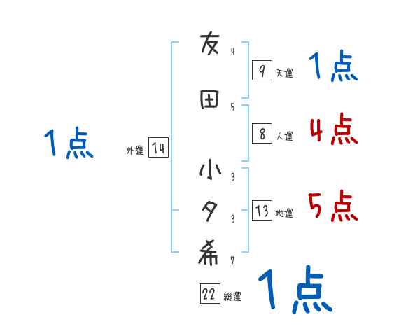 | 総運  | 友田小夕希さんの総運は22画の1つ星!努力することが苦手ないっぽう手先が器用。芸術性にも優れる。あなたの人生を表す1番重要な運勢です。生涯を通じて影響する総合運となり、主に50歳以降の晩年期に影響を及ぼします。 |