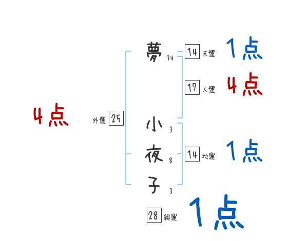 天運![]() | 夢小夜子さんの天運は14画の1つ星!人に対して優しいがストレスを溜め込みがち。人間関係のトラブルを避けるよう気をつけましょう。 家系が持つ宿命的な運勢を表します。祖先から受け継いだ苗字ですので自分の力が及びません。家柄を象徴します。 |