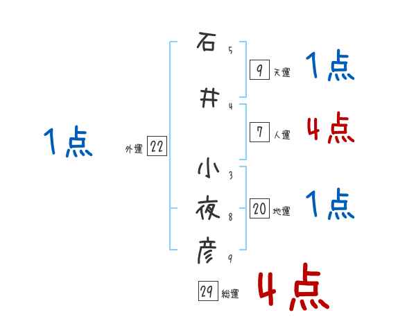 総運![]() | 石井小夜彦さんの総運は29画の4つ星!完全主義で才能がある。厳格な心の持ち主。 あなたの人生を表す1番重要な運勢です。生涯を通じて影響する総合運となり、主に50歳以降の晩年期に影響を及ぼします。 |