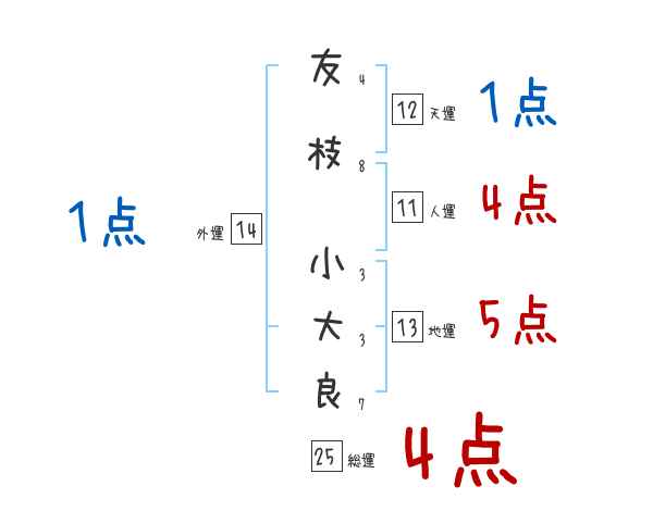 天運![]() | 友枝小大良さんの天運は12画の1つ星!簡単な失敗で諦めてしまいやすいかも。着実に行動すると良いでしょう。 家系が持つ宿命的な運勢を表します。祖先から受け継いだ苗字ですので自分の力が及びません。家柄を象徴します。 |