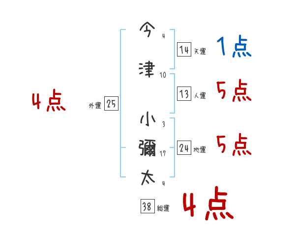 外運![]() | 今津小彌太さんの外運は25画の4つ星!個性があり才能があふれる。強運の持ち主で発展する。 生活面を象徴する運勢です。外部から受ける影響力を表し、結婚運、家庭運や職場、環境への順応性を表します。 |