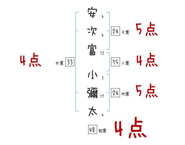 天運![]() | 安次富小彌太さんの天運は24画の5つ星!家庭運が良く順調な人生。金運にも恵まれる。 家系が持つ宿命的な運勢を表します。祖先から受け継いだ苗字ですので自分の力が及びません。家柄を象徴します。 |