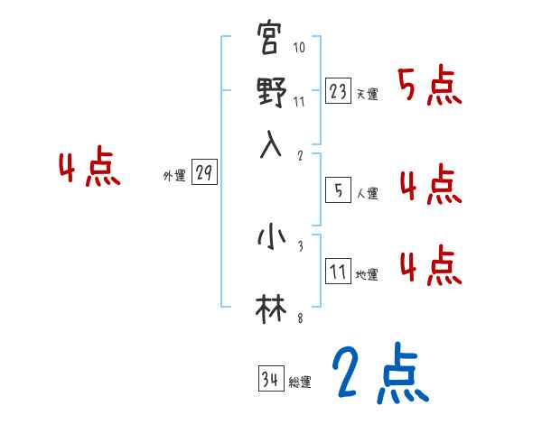 外運![]() | 宮野入小林さんの外運は29画の4つ星!完全主義で才能がある。厳格な心の持ち主。 生活面を象徴する運勢です。外部から受ける影響力を表し、結婚運、家庭運や職場、環境への順応性を表します。 |
