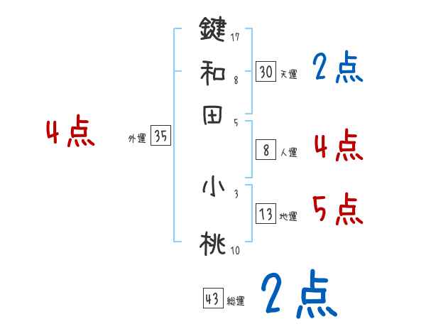 天運![]() | 鍵和田小桃さんの天運は30画の2つ星!浮き沈みの激しさに注意しましょう。 家系が持つ宿命的な運勢を表します。祖先から受け継いだ苗字ですので自分の力が及びません。家柄を象徴します。 |