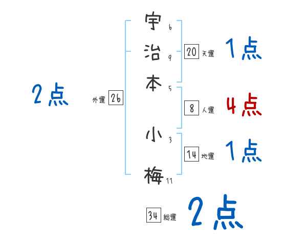 総運![]() | 宇治本小梅さんの総運は34画の2つ星!独創性に優れるが、自尊心が強く災難に注意しましょう。 あなたの人生を表す1番重要な運勢です。生涯を通じて影響する総合運となり、主に50歳以降の晩年期に影響を及ぼします。 |
