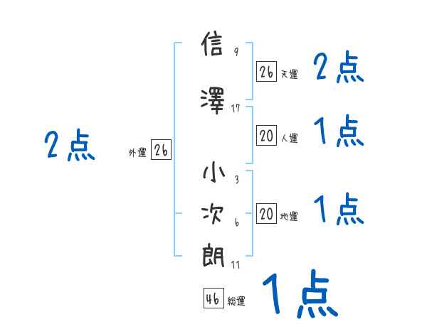外運![]() | 信澤小次朗さんの外運は26画の2つ星!波瀾万丈かも。信頼できる人を大事にしましょう。 生活面を象徴する運勢です。外部から受ける影響力を表し、結婚運、家庭運や職場、環境への順応性を表します。 |
