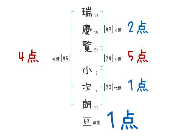 天運![]() | 瑞慶覧小次朗さんの天運は49画の2つ星!不安定な性格で明暗がある人生。周りの人には支援されやすい。 家系が持つ宿命的な運勢を表します。祖先から受け継いだ苗字ですので自分の力が及びません。家柄を象徴します。 |