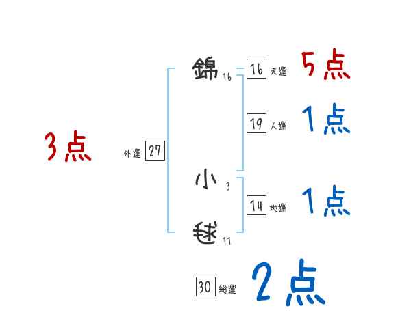 天運![]() | 錦小毬さんの天運は16画の5つ星!人望が厚く大きく発展する。逆転成功が見える。 家系が持つ宿命的な運勢を表します。祖先から受け継いだ苗字ですので自分の力が及びません。家柄を象徴します。 |