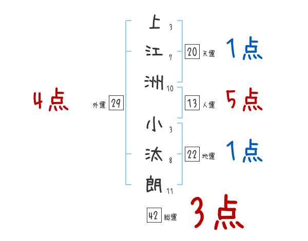 総運![]() | 上江洲小汰朗さんの総運は42画の3つ星!病気に注意。多芸であるが消極的でおとなしい。 あなたの人生を表す1番重要な運勢です。生涯を通じて影響する総合運となり、主に50歳以降の晩年期に影響を及ぼします。 |
