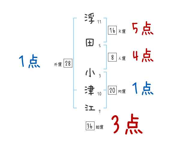 外運![]() | 浮田小津江さんの外運は28画の1つ星!家庭環境に注意。スポーツで活躍できる能力があるかも。 生活面を象徴する運勢です。外部から受ける影響力を表し、結婚運、家庭運や職場、環境への順応性を表します。 |