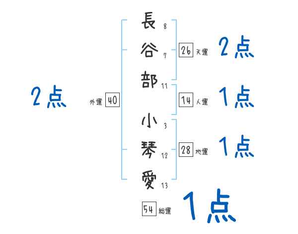 地運![]() | 長谷部小琴愛さんの地運は28画の1つ星!家庭環境に注意。スポーツで活躍できる能力があるかも。 個性を表す基礎的な運勢です。性格形成や対人関係、行動力など家庭環境に影響されます。主に誕生してから20歳くらいまでの若年期の運勢を表します。 |