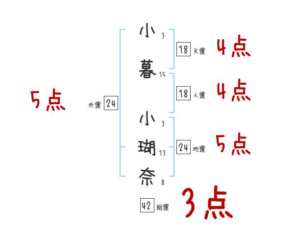 外運![]() | 小暮小瑚奈さんの外運は24画の5つ星!家庭運が良く順調な人生。金運にも恵まれる。 生活面を象徴する運勢です。外部から受ける影響力を表し、結婚運、家庭運や職場、環境への順応性を表します。 |