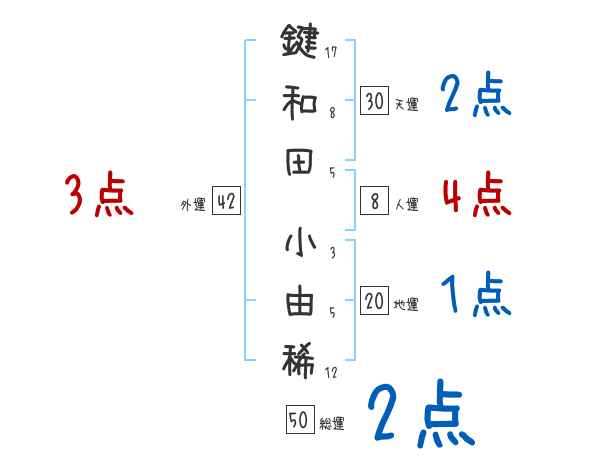 外運![]() | 鍵和田小由稀さんの外運は42画の3つ星!病気に注意。多芸であるが消極的でおとなしい。 生活面を象徴する運勢です。外部から受ける影響力を表し、結婚運、家庭運や職場、環境への順応性を表します。 |