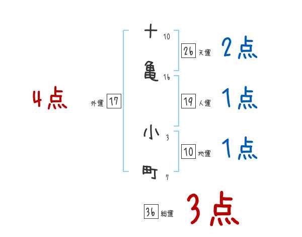 天運![]() | 十亀小町さんの天運は26画の2つ星!波瀾万丈かも。信頼できる人を大事にしましょう。 家系が持つ宿命的な運勢を表します。祖先から受け継いだ苗字ですので自分の力が及びません。家柄を象徴します。 |