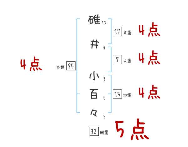 総運![]() | 碓井小百々さんの総運は32画の5つ星!柔軟性があり成功する。チャンスが多く金運が良い。 あなたの人生を表す1番重要な運勢です。生涯を通じて影響する総合運となり、主に50歳以降の晩年期に影響を及ぼします。 |