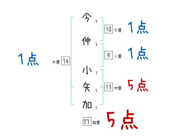 天運![]() | 今仲小矢加さんの天運は10画の1つ星!不安を感じやすい傾向。ストレスを抱えないように注意しましょう。 家系が持つ宿命的な運勢を表します。祖先から受け継いだ苗字ですので自分の力が及びません。家柄を象徴します。 |