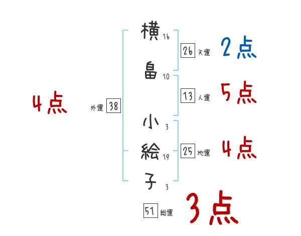 総運![]() | 横畠小絵子さんの総運は51画の3つ星!変化が激しく、危険に注意。堅実な性格。 あなたの人生を表す1番重要な運勢です。生涯を通じて影響する総合運となり、主に50歳以降の晩年期に影響を及ぼします。 |