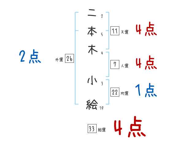 人運![]() | 二本木小絵さんの人運は7画の4つ星!強い意志や信念を持ち独立心が強い。自立する。 性格や才能などを表す2番目に重要な運勢です。人間関係や協調性、社会的な成功に影響します。主に20歳から50歳ぐらいまでの中年期の運勢を表します。 |