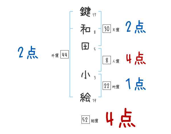 外運![]() | 鍵和田小絵さんの外運は44画の2つ星!誠実で慎重な性格。物事を考えすぎないように注意しましょう。 生活面を象徴する運勢です。外部から受ける影響力を表し、結婚運、家庭運や職場、環境への順応性を表します。 |