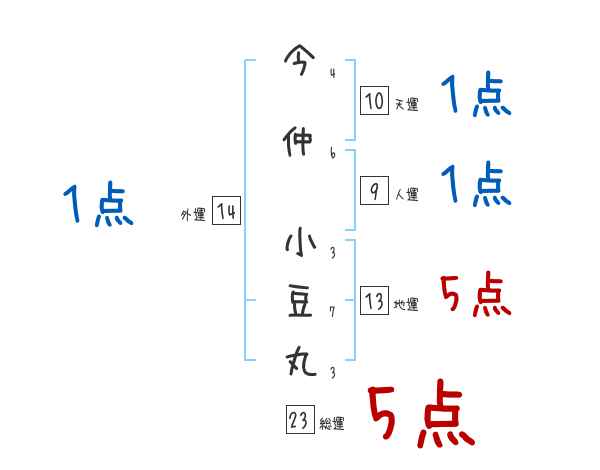 外運![]() | 今仲小豆丸さんの外運は14画の1つ星!人に対して優しいがストレスを溜め込みがち。人間関係のトラブルを避けるよう気をつけましょう。 生活面を象徴する運勢です。外部から受ける影響力を表し、結婚運、家庭運や職場、環境への順応性を表します。 |