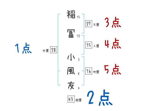 外運![]() | 稲冨小風友さんの外運は28画の1つ星!家庭環境に注意。スポーツで活躍できる能力があるかも。 生活面を象徴する運勢です。外部から受ける影響力を表し、結婚運、家庭運や職場、環境への順応性を表します。 |