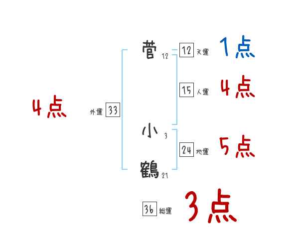 総運![]() | 菅小鶴さんの総運は36画の3つ星!先見性が豊かです。多少神経質で苦労することも。 あなたの人生を表す1番重要な運勢です。生涯を通じて影響する総合運となり、主に50歳以降の晩年期に影響を及ぼします。 |