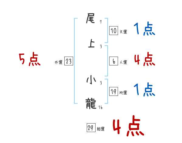 天運![]() | 尾上小龍さんの天運は10画の1つ星!不安を感じやすい傾向。ストレスを抱えないように注意しましょう。 家系が持つ宿命的な運勢を表します。祖先から受け継いだ苗字ですので自分の力が及びません。家柄を象徴します。 |