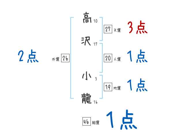 外運![]() | 高沢小龍さんの外運は26画の2つ星!波瀾万丈かも。信頼できる人を大事にしましょう。 生活面を象徴する運勢です。外部から受ける影響力を表し、結婚運、家庭運や職場、環境への順応性を表します。 |