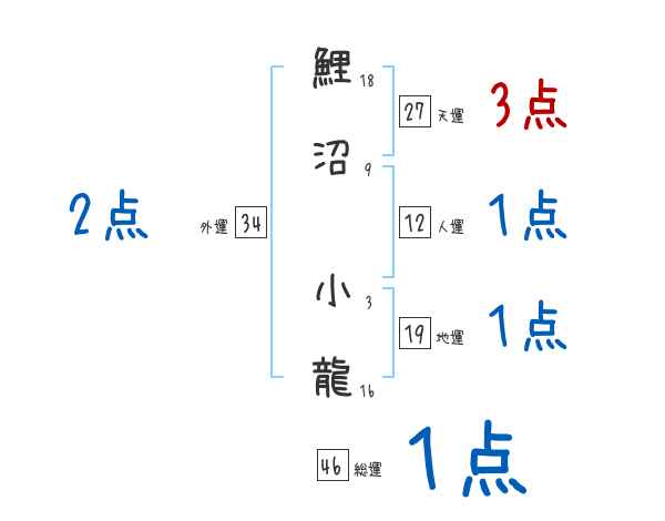 天運![]() | 鯉沼小龍さんの天運は27画の3つ星!頭脳明晰だが強情で摩擦が多い傾向。孤立に注意。 家系が持つ宿命的な運勢を表します。祖先から受け継いだ苗字ですので自分の力が及びません。家柄を象徴します。 |