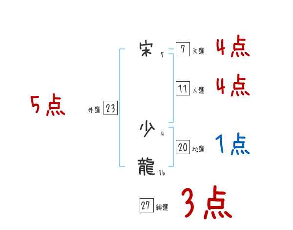 天運![]() | 宋少龍さんの天運は7画の4つ星!強い意志や信念を持ち独立心が強い。自立する。 家系が持つ宿命的な運勢を表します。祖先から受け継いだ苗字ですので自分の力が及びません。家柄を象徴します。 |