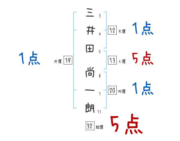 天運![]() | 三井田尚一朗さんの天運は12画の1つ星!簡単な失敗で諦めてしまいやすいかも。着実に行動すると良いでしょう。 家系が持つ宿命的な運勢を表します。祖先から受け継いだ苗字ですので自分の力が及びません。家柄を象徴します。 |
