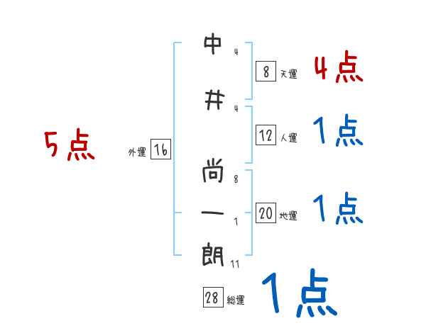 外運![]() | 中井尚一朗さんの外運は16画の5つ星!人望が厚く大きく発展する。逆転成功が見える。 生活面を象徴する運勢です。外部から受ける影響力を表し、結婚運、家庭運や職場、環境への順応性を表します。 |