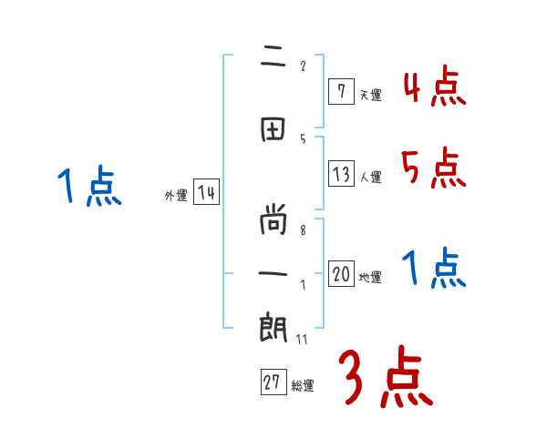 天運![]() | 二田尚一朗さんの天運は7画の4つ星!強い意志や信念を持ち独立心が強い。自立する。 家系が持つ宿命的な運勢を表します。祖先から受け継いだ苗字ですので自分の力が及びません。家柄を象徴します。 |