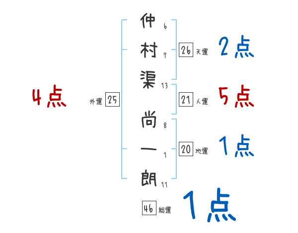 天運![]() | 仲村渠尚一朗さんの天運は26画の2つ星!波瀾万丈かも。信頼できる人を大事にしましょう。 家系が持つ宿命的な運勢を表します。祖先から受け継いだ苗字ですので自分の力が及びません。家柄を象徴します。 |