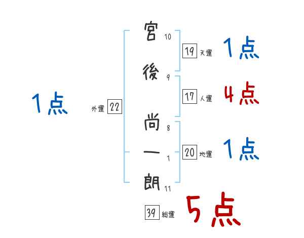 天運![]() | 宮後尚一朗さんの天運は19画の1つ星!優れた才能を持ちますが、協調性が足りないことも。周りの人と協力する事を意識しましょう。 家系が持つ宿命的な運勢を表します。祖先から受け継いだ苗字ですので自分の力が及びません。家柄を象徴します。 |