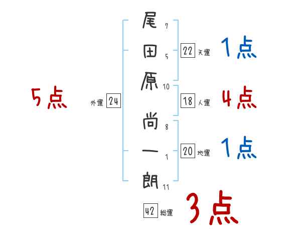 外運![]() | 尾田原尚一朗さんの外運は24画の5つ星!家庭運が良く順調な人生。金運にも恵まれる。 生活面を象徴する運勢です。外部から受ける影響力を表し、結婚運、家庭運や職場、環境への順応性を表します。 |