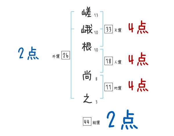 総運![]() | 嵯峨根尚之さんの総運は44画の2つ星!誠実で慎重な性格。物事を考えすぎないように注意しましょう。 あなたの人生を表す1番重要な運勢です。生涯を通じて影響する総合運となり、主に50歳以降の晩年期に影響を及ぼします。 |
