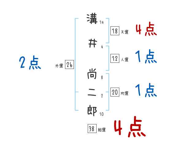 外運![]() | 溝井尚二郎さんの外運は26画の2つ星!波瀾万丈かも。信頼できる人を大事にしましょう。 生活面を象徴する運勢です。外部から受ける影響力を表し、結婚運、家庭運や職場、環境への順応性を表します。 |