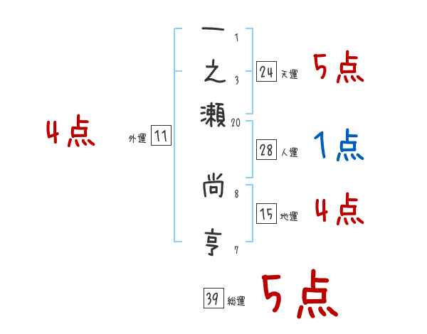 天運![]() | 一之瀬尚亨さんの天運は24画の5つ星!家庭運が良く順調な人生。金運にも恵まれる。 家系が持つ宿命的な運勢を表します。祖先から受け継いだ苗字ですので自分の力が及びません。家柄を象徴します。 |