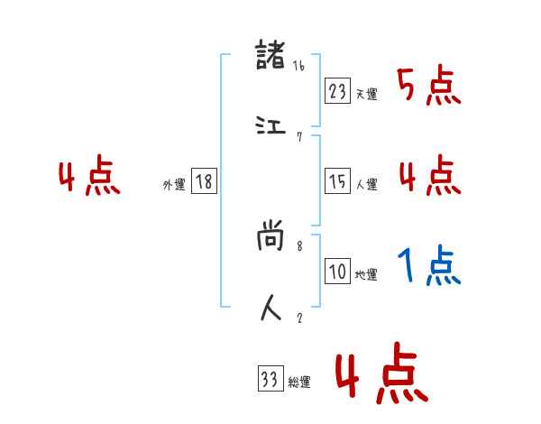 天運![]() | 諸江尚人さんの天運は23画の5つ星!想像力に優れ活力がある。一代で成功し名誉を手に入れる。 家系が持つ宿命的な運勢を表します。祖先から受け継いだ苗字ですので自分の力が及びません。家柄を象徴します。 |