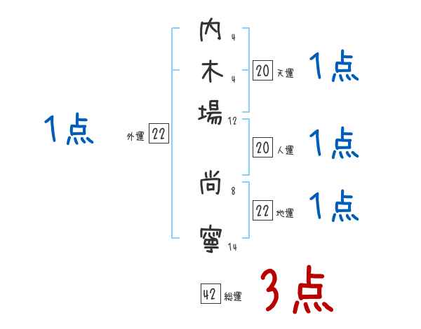 外運![]() | 内木場尚寧さんの外運は22画の1つ星!努力することが苦手ないっぽう手先が器用。芸術性にも優れる。 生活面を象徴する運勢です。外部から受ける影響力を表し、結婚運、家庭運や職場、環境への順応性を表します。 |