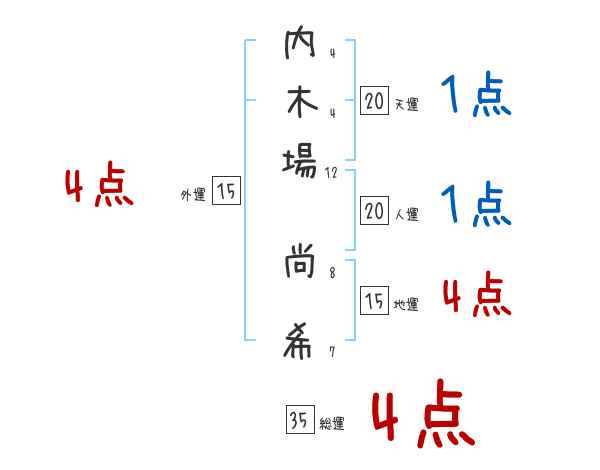 外運![]() | 内木場尚希さんの外運は15画の4つ星!人徳があり出世する。順調に物事を進め円満な人生。 生活面を象徴する運勢です。外部から受ける影響力を表し、結婚運、家庭運や職場、環境への順応性を表します。 |