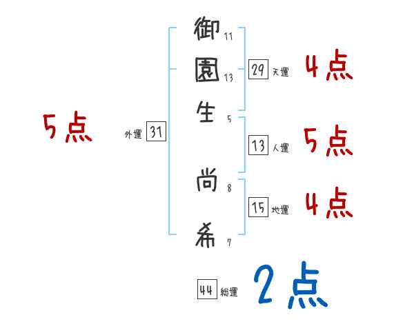 人運![]() | 御園生尚希さんの人運は13画の5つ星!才能に恵まれ人気がある。名声を手に入れる。円満な人生。 性格や才能などを表す2番目に重要な運勢です。人間関係や協調性、社会的な成功に影響します。主に20歳から50歳ぐらいまでの中年期の運勢を表します。 |