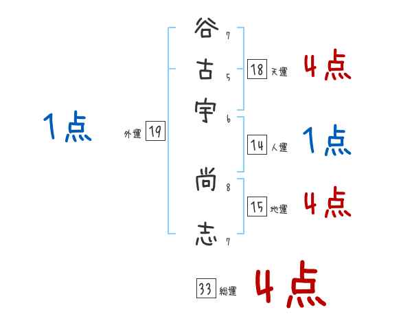 天運![]() | 谷古宇尚志さんの天運は18画の4つ星!情熱的で剛気。忍耐力があり信頼される。 家系が持つ宿命的な運勢を表します。祖先から受け継いだ苗字ですので自分の力が及びません。家柄を象徴します。 |