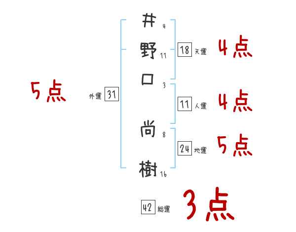 外運![]() | 井野口尚樹さんの外運は31画の5つ星!社交性があり判断力に優れる。順風満帆な人生で円満な生活。 生活面を象徴する運勢です。外部から受ける影響力を表し、結婚運、家庭運や職場、環境への順応性を表します。 |