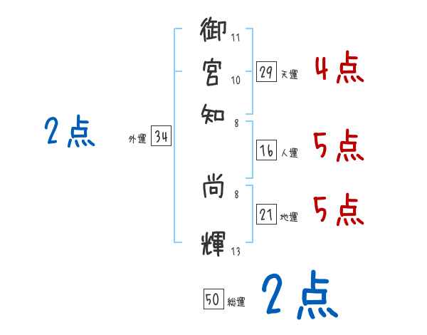 総運![]() | 御宮知尚輝さんの総運は50画の2つ星!浮き沈みが激しく不安定。しりすぼみに衰退しやすいので注意しましょう。 あなたの人生を表す1番重要な運勢です。生涯を通じて影響する総合運となり、主に50歳以降の晩年期に影響を及ぼします。 |