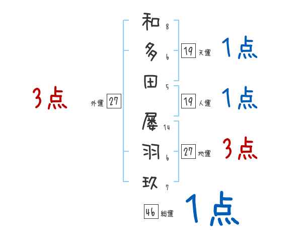 地運![]() | 和多田屡羽玖さんの地運は27画の3つ星!頭脳明晰だが強情で摩擦が多い傾向。孤立に注意。 個性を表す基礎的な運勢です。性格形成や対人関係、行動力など家庭環境に影響されます。主に誕生してから20歳くらいまでの若年期の運勢を表します。 |